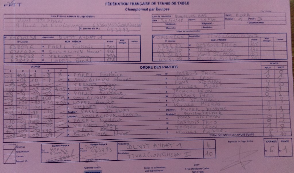 CHAMPIONNAT PAR EQUIPES, 6ème journée / Contre DLV TT AYDAT 1