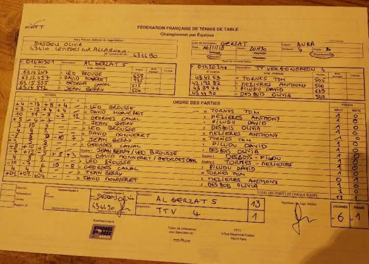 CHAMPIONNAT PAR EQUIPES, 6ème journée / Contre AL GERZAT 5