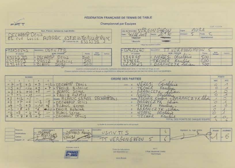 CHAMPIONNAT PAR EQUIPES, 6ème journée / Contre USMV TT 5