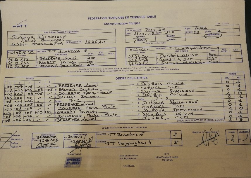 CHAMPIONNAT PAR EQUIPES, 8ème journée / Contre TT BRIVADOIS 6