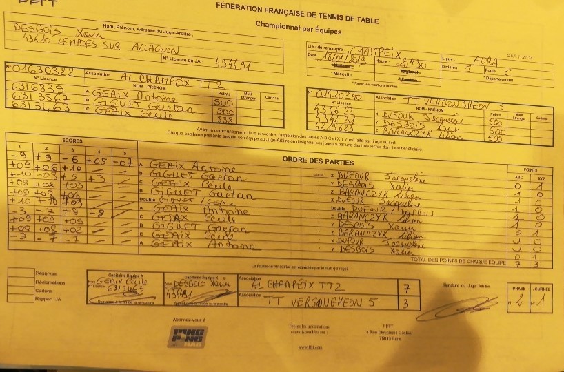 CHAMPIONNAT PAR EQUIPES, 8ème journée / Contre TT CHAMPEIX 2