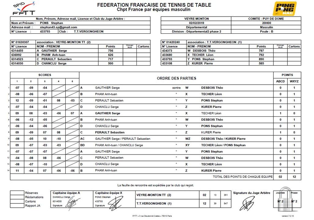 CHAMPIONNAT PAR EQUIPES, 9ème journée / Contre VEYRE MONTON TT 2