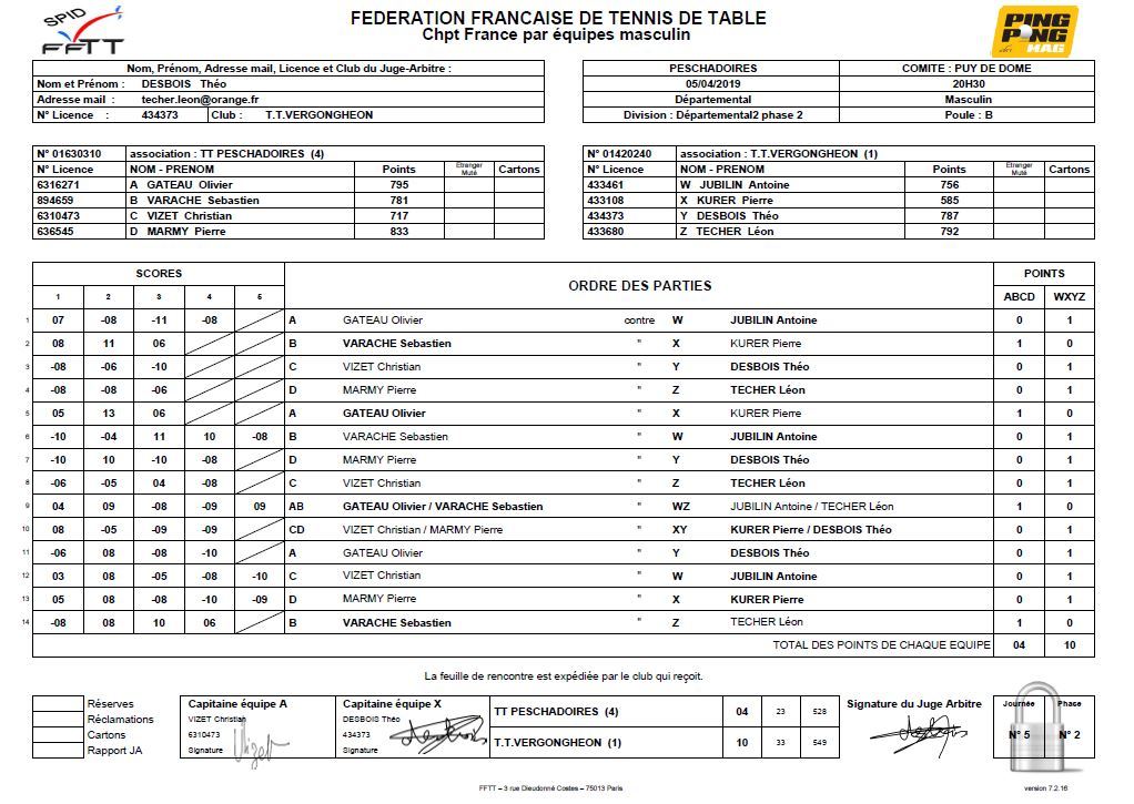 CHAMPIONNAT PAR EQUIPES, 12ème journée / Contre TT PESCHADOIRES 3
