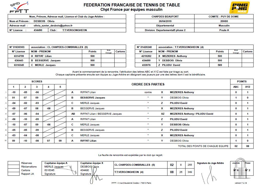 CHAMPIONNAT PAR EQUIPES, 13ème journée / Contre CL CHAPDES-COMB 5