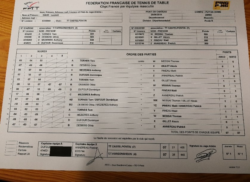 CHAMPIONNAT PAR EQUIPES, 1ère journée / Contre TT CASTELPONTIN 7