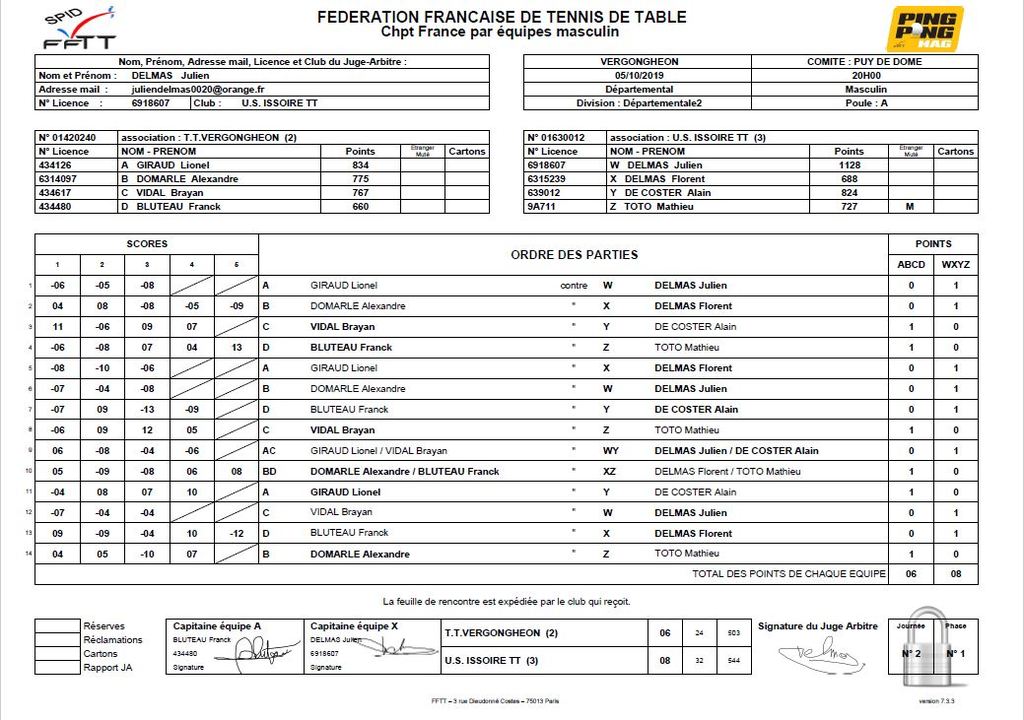 CHAMPIONNAT PAR EQUIPES, 2ème journée / Contre ISSOIRE US 3