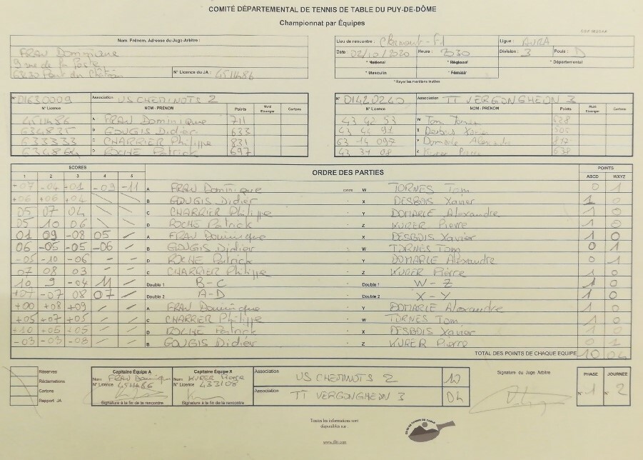 La semaine dernière nous nous sommes inclinés 10-4 chez les cheminots. L’équipe était composée de Tom Xavier Alexandre et moi ; les classements étaient un peu plus élevés chez nos adversaires et malgré quelques matchs gagnés et une petite perf de Tom (2 victoires) et une victoire d’Alexandre ainsi qu’une de ma part nos adversaires du soir étaient sensiblement meilleurs. Notons cependant encore 2 défaites lors des doubles, qui (s’ils ne changeaient pas la finalité du résultat) nous auraient permis d’être plus accrocheurs.