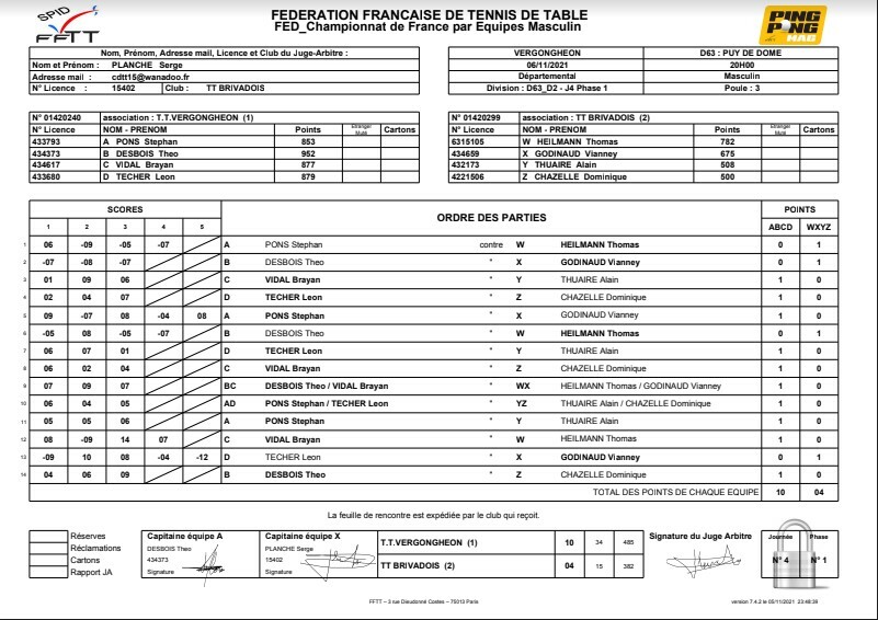 CHAMPIONNAT PAR EQUIPES, 4ème journée / Contre TT BRIVADOIS 2