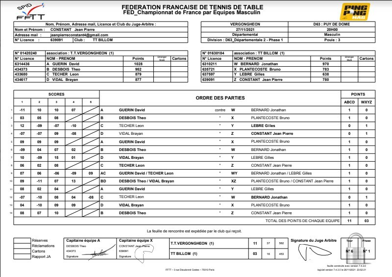 CHAMPIONNAT PAR EQUIPES, 6ème journée / Contre TT BILLOM 1
