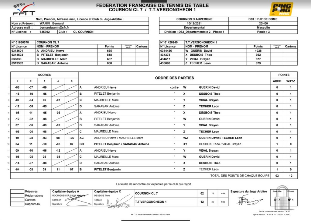 CHAMPIONNAT PAR EQUIPES, 7ème journée / Contre COURNON CL 7