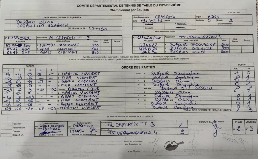 CHAMPIONNAT PAR EQUIPES, 10ème journée / Contre TT CHAMPEIX 3