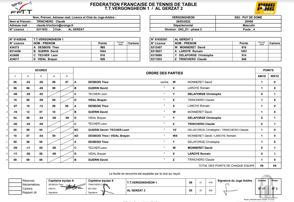 CHAMPIONNAT PAR EQUIPES, 12ème journée / Contre AL GERZAT 2