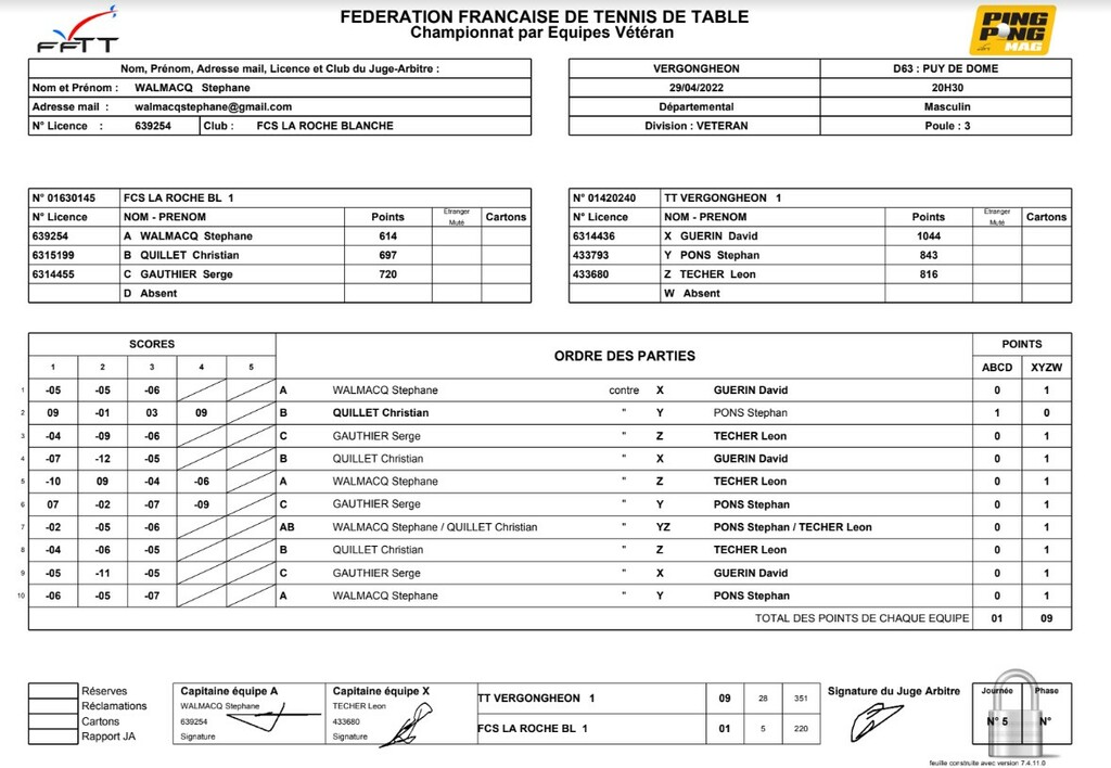 Hier soir a eu lieu, la 5ème journée de championnat par équipes vétéran, l'équipe du TTV 1 composé de David, Stéphan et Léon (2703 points à trois) jouaient contre FCS LA ROCHE BLANCHE 1 (2031 points sur l'ensemble des joueurs), fait un un très bon résultat avec une victoire 9-1.