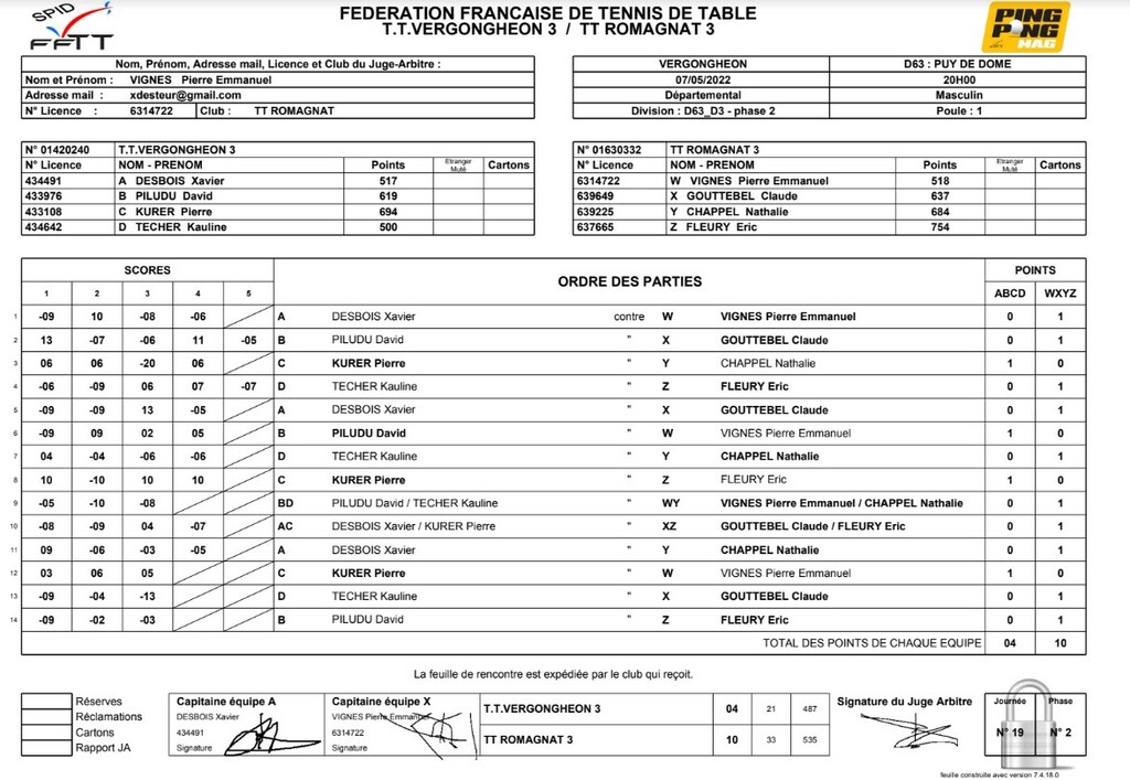 CHAMPIONNAT PAR EQUIPES, 14ème journée / Contre TT ROMAGNAT 3