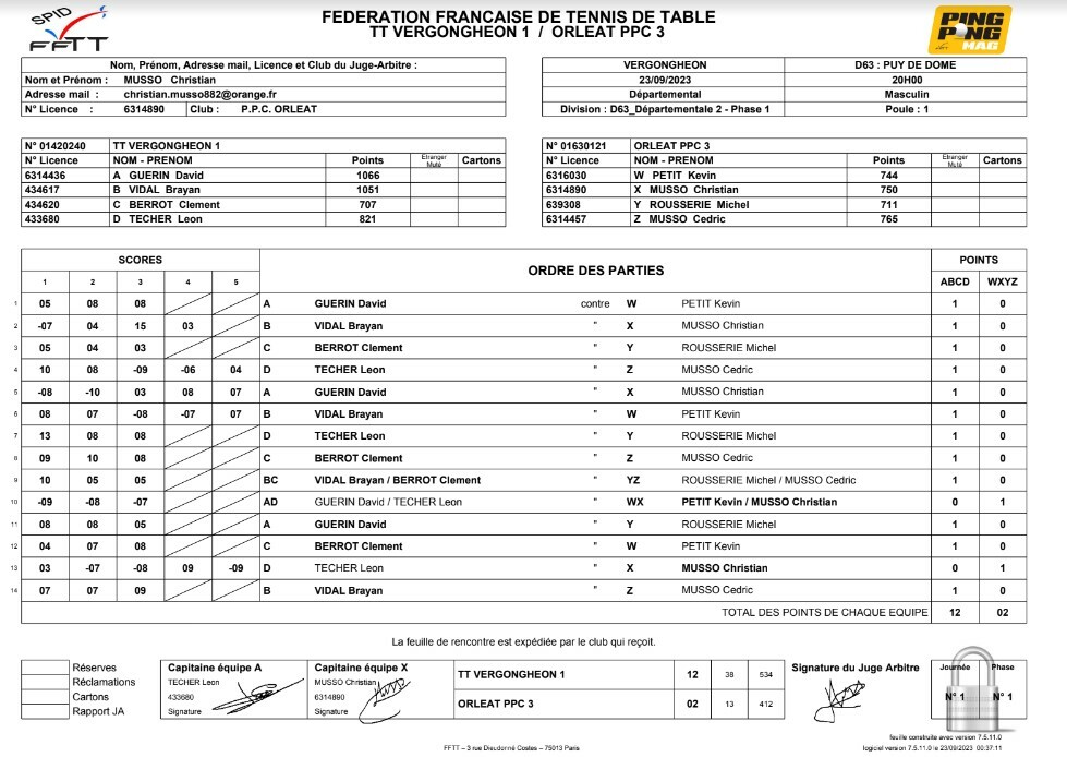 Rencontre remporté 12-2, score qui ne refléte pas la fisionomie des matchs, un grand bravo à Clement pour son retour et Brayan qui font le plein de points avec 3 simples et leur double, quand a David gagne ses 3 simpleset perd le double avec moi (désoler la machine) et enfin moi, je fais que 2 simples (merci Picot).