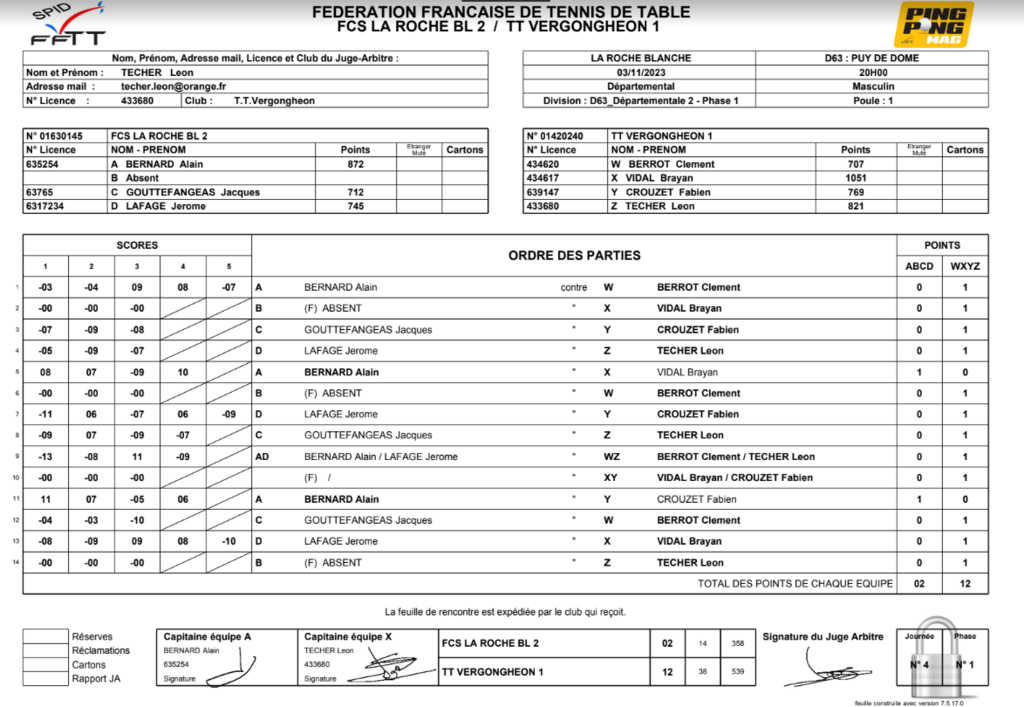 CHAMPIONNAT PAR EQUIPES, 4ème journée / Contre FCS LA ROCHE BL 2