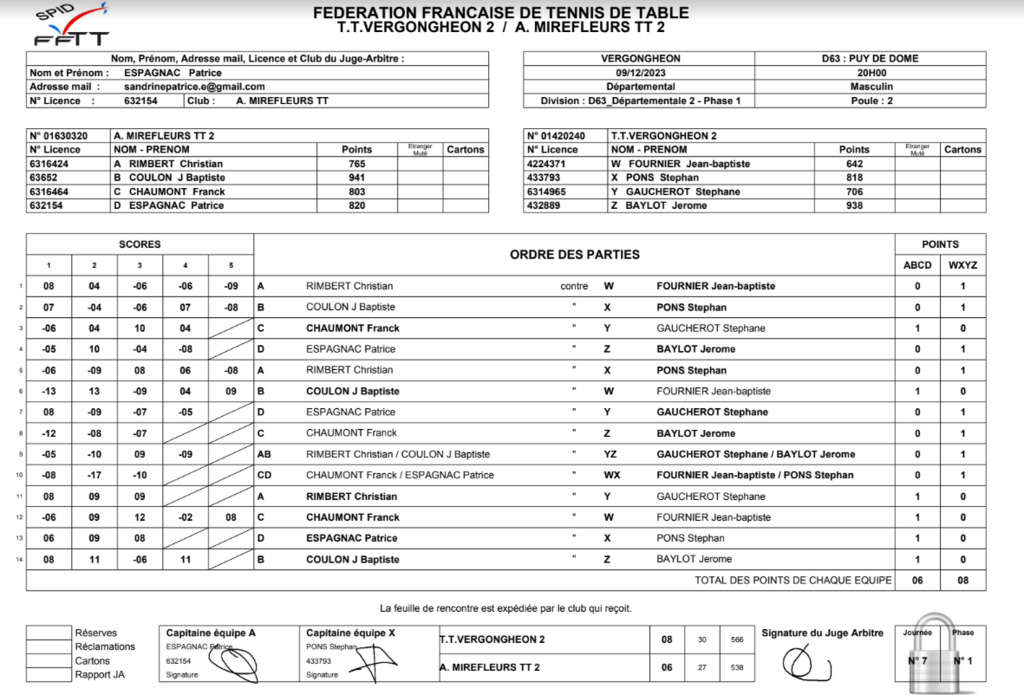 CHAMPIONNAT PAR EQUIPES, 7ème journée / Contre A.MIREFLEURS TT 2