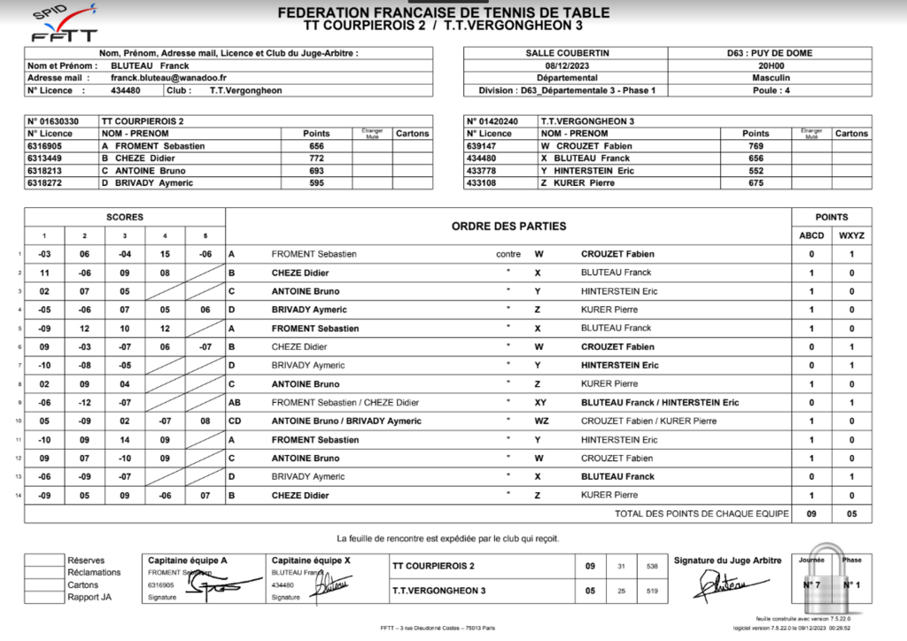 CHAMPIONNAT PAR EQUIPES, 7ème journée / Contre TT COURPIEROIS 2