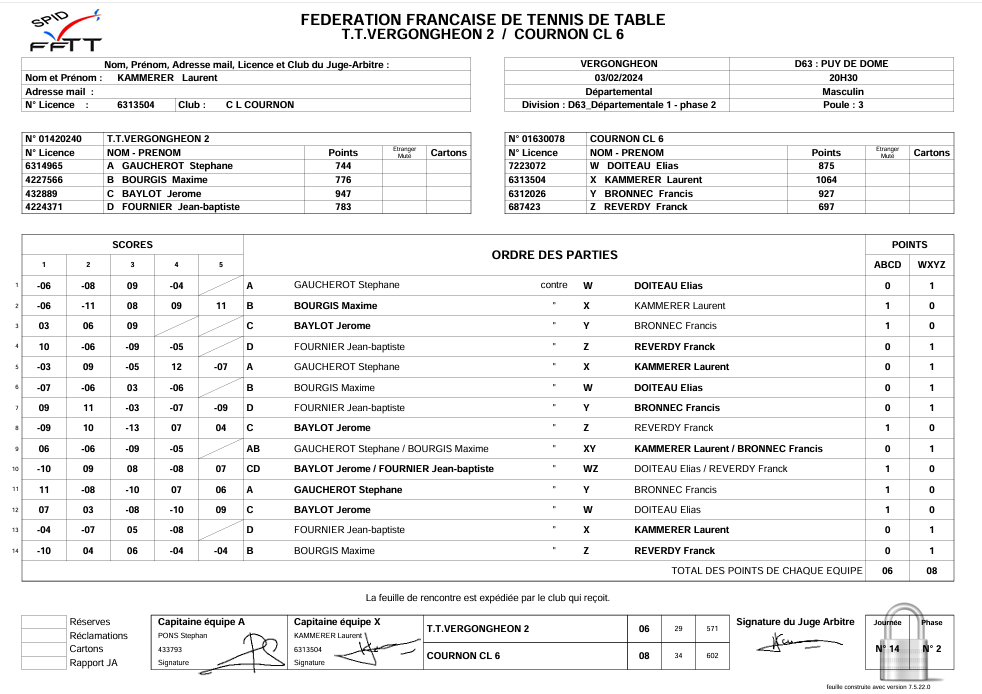 CHAMPIONNAT PAR EQUIPES, 14ème journée / Contre COURNON CL 6