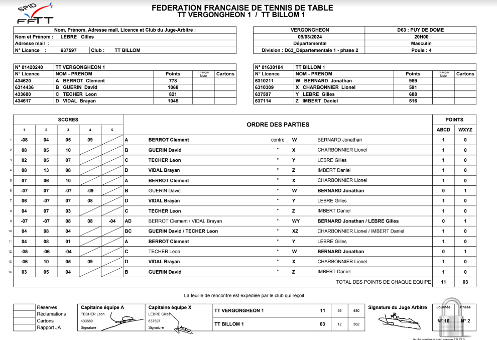 CHAMPIONNAT PAR EQUIPES, 16ème journée / Contre TT BILLOM 1