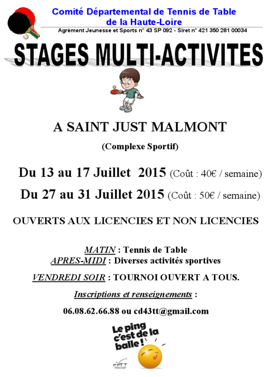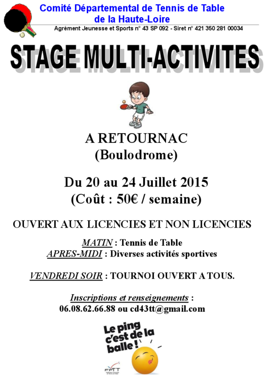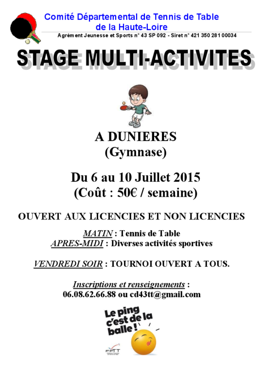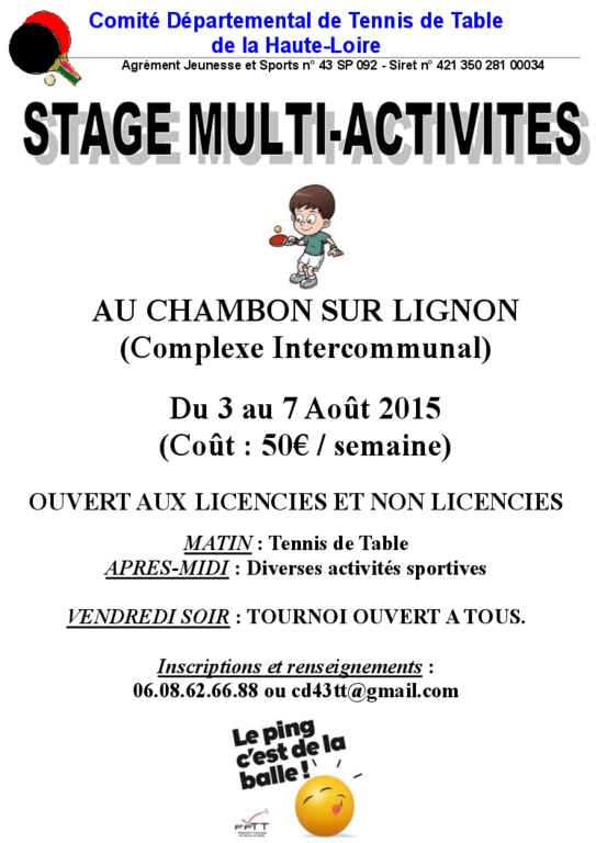 Le CD43 vous propose des stages cette été avec matinée Tennis de tables et d'autre activité les après midi selon le temps